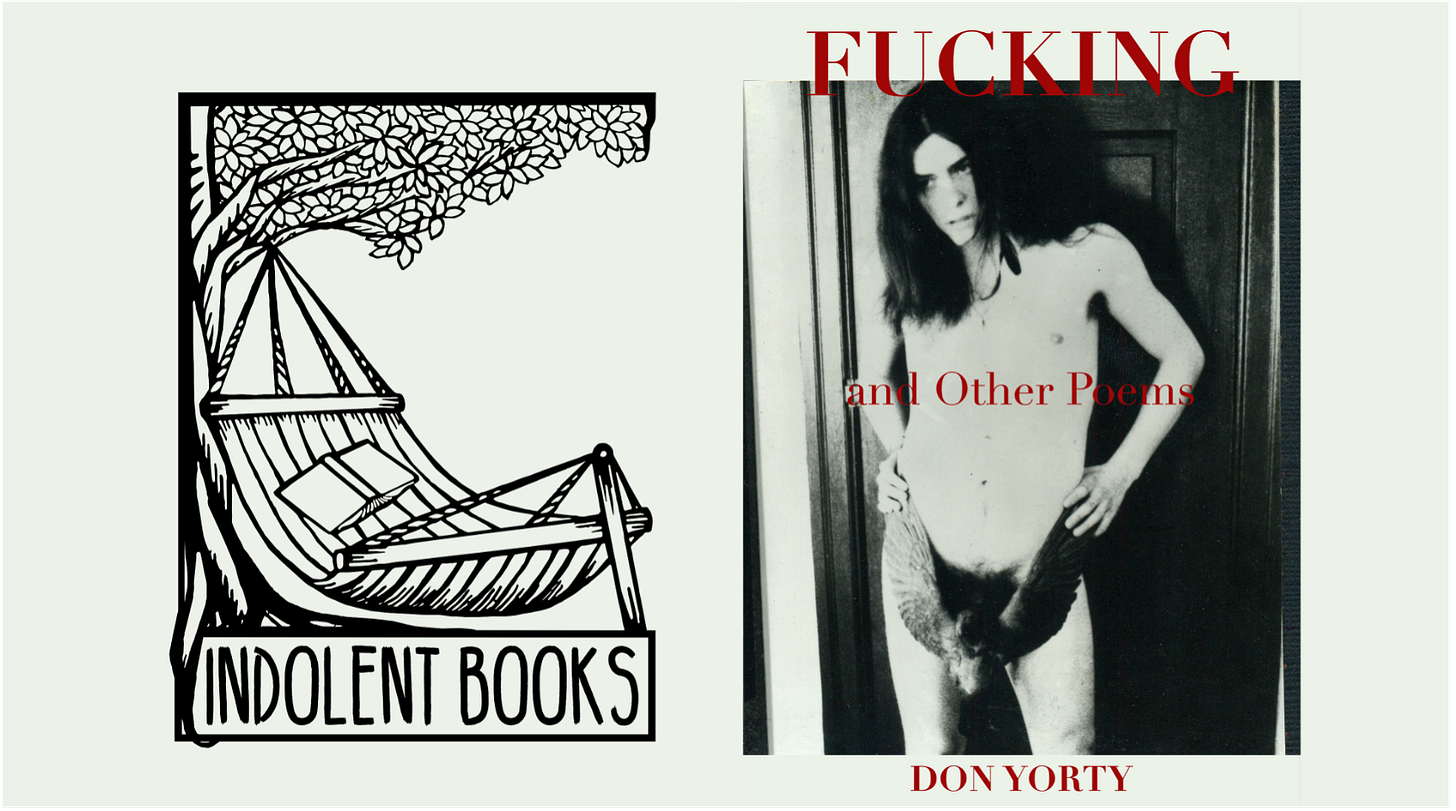 Don Yorty's long awaited Fucking and Other Poems is now available directly from Indolent Books. Order yours now! Purchase price of $20.00 includes SHIPPING!